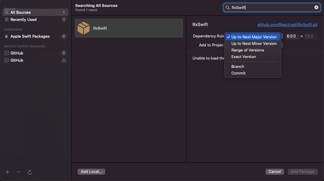 그러면 Dependuncy Rule이라는 메뉴가 있고, 위에서 적었던 것들이 나오죠 ? 그리고 재밌는건 지금 6.0.0 으로 입력이 되어있는데 그럼 최대 커버 가능한 버전이 7.0.0 이라고 자동으로 찍혀서 나옵니다. 현재 RxSwift의 릴리즈된 버전이 6.5.0 이라서 그래요. 당연히 저 최소버전은 지정할 수 있습니다. 저걸 Minor로 바꾸면 어떻게 될까요 ?