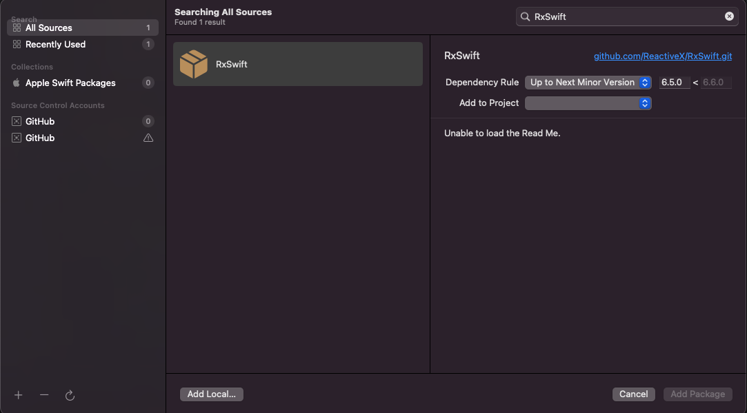 그리고 Package.swift 파일로 의존성을 추가하지 않고 Xcode로 SPM을 추가할 수도 있는데요. 이 방법 같은 경우엔 이 타입메서드가 뜻이 뭐였더라? 혹은 어느버전까지 지원했더라? 하고 헷갈릴 때 확인하는 용도로도 좋습니다. File -> Add Packages... 을 해볼게요. 그러면 아래의 팝업창이 뜹니다. 그리고 원하는 라이브러리를 검색해주면 되는데, 여기서는 RxSwift를 입력해볼게요. git 주소로도 가능합니다.
