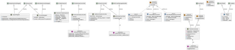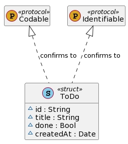 Codable <|.. ToDo : confirms to그리고 위로 올라가서 Refresh 버튼을 탭하거나 Alt+Enter 키를 누르면 브라우저에서 UML 다이어그램을 다시 그려주고 고친 부분이 수정되어 나오는 것을 볼 수 있습니다.