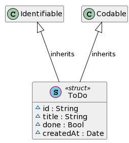 ToDo 라는 모델이 있고 iOS 개발을 하면서 흔히 마주할 수 있는 대표적인 Identifiable, Codable 프로토콜을 채택하고 있죠. 하지만 UML 다이어그램 상으로는 상속으로 표현이 되고 있습니다. 이런 부분을 위에서 말했던 Edit 모드를 통해 수정할 수 있어요.