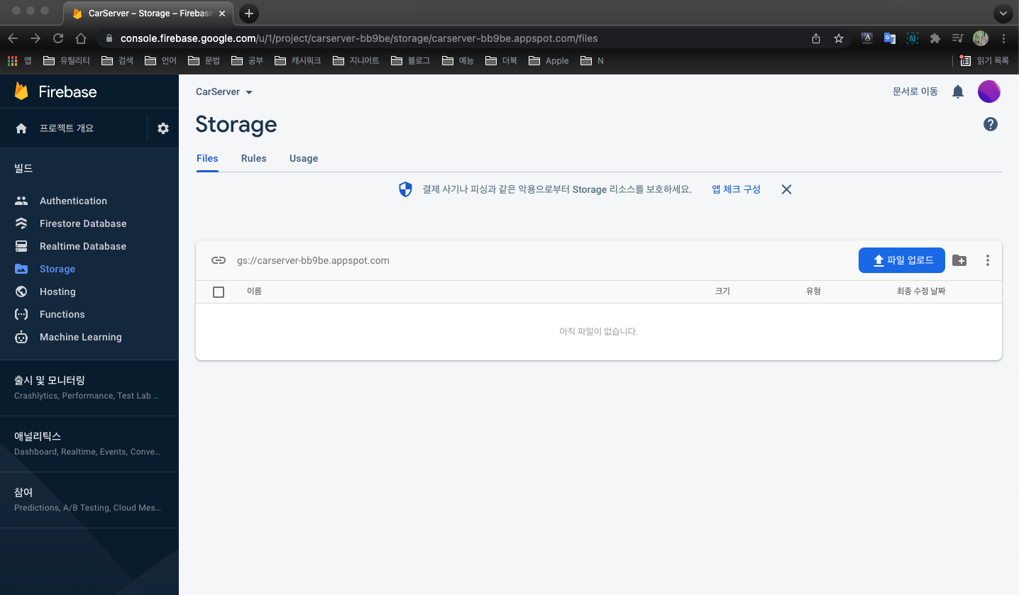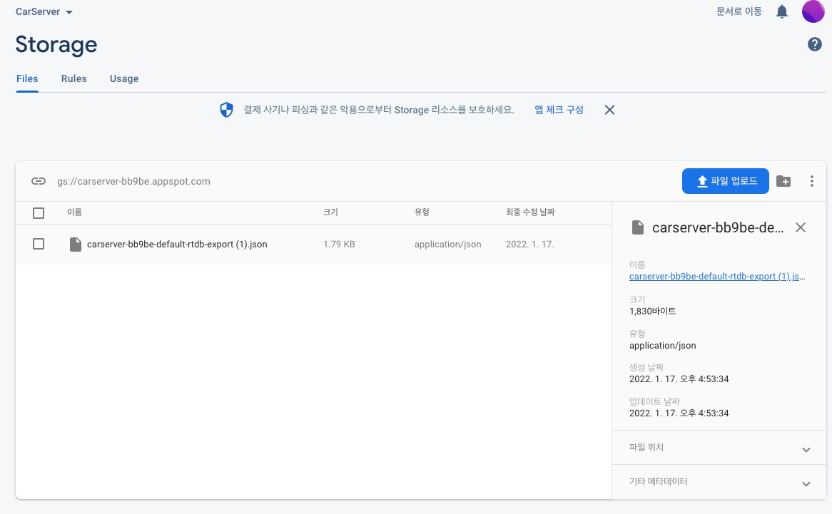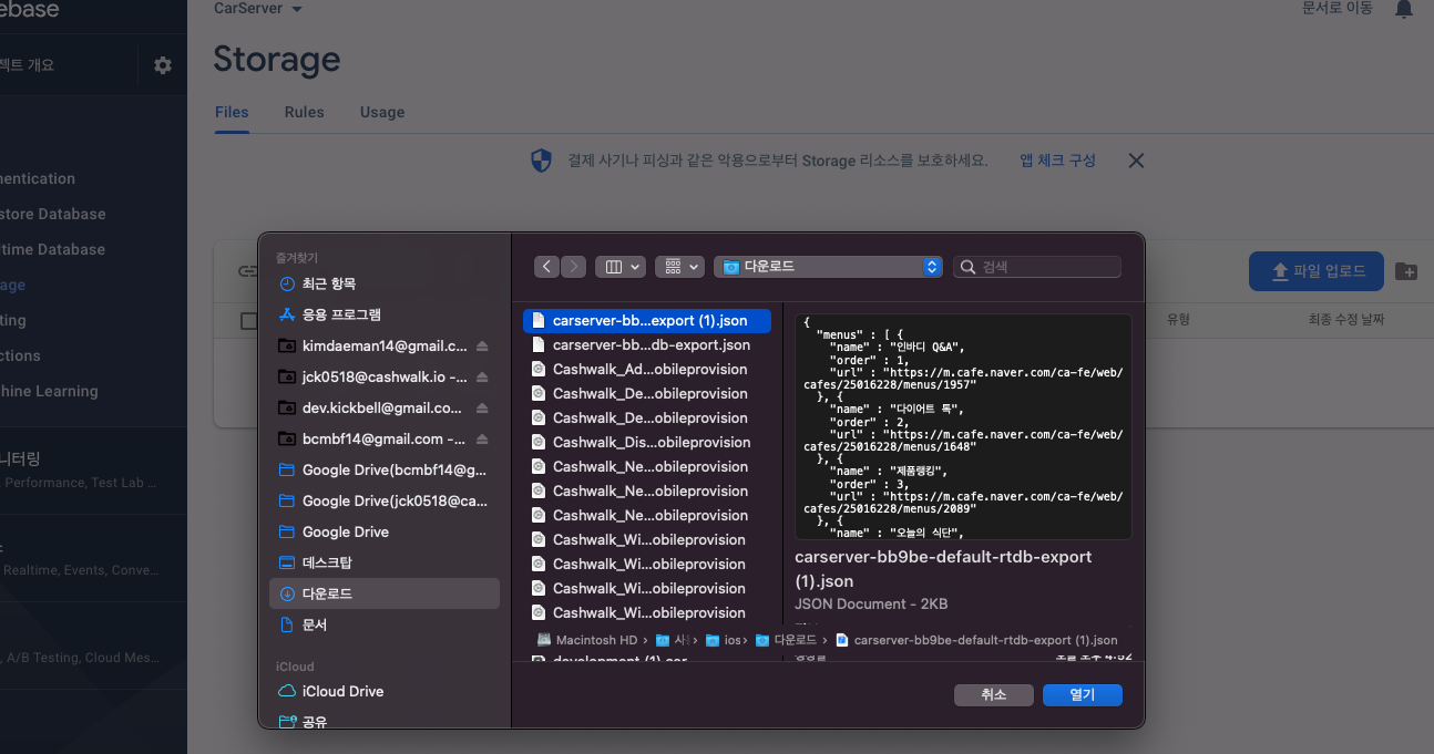 자, 이제 json 파일이 생겼으니 업로드를 해볼까요? 다시 Storage로 돌아와서 파일업로드 버튼을 누르고 방금 다운받은 json 파일을 선택해줍니다.