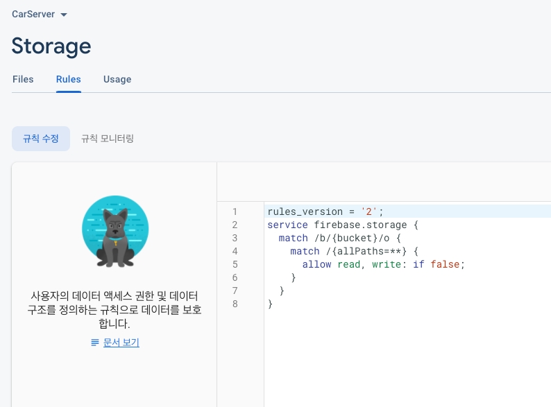 이건 해당 프로젝트 스토리지에 접근할 수 있는 권한을 규칙으로 정의해 놓은 건데요. 현재는 모두 읽기가 허용되고, 수정하기는 허용되지 않은 상황입니다. 자세한 규칙은 여기를 참고하세요.