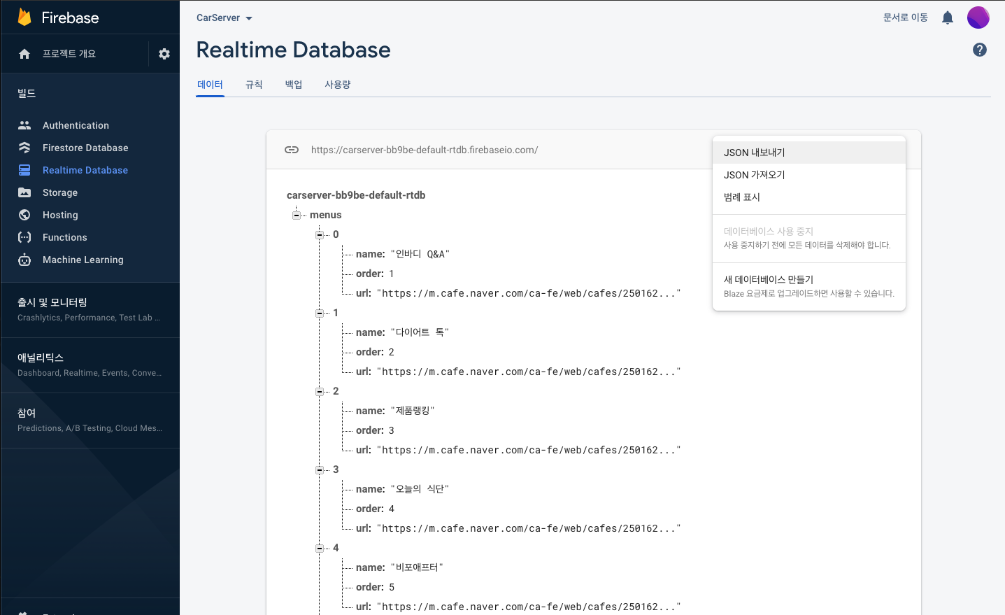 이제 json 파일을 하나 만들어보겠습니다. json 파일이야 다양한 방법으로 만들 수 있겠으나, 저는 Storage 바로 위 메뉴인 Realtime Database를 통해서 만들어 봤어요.
