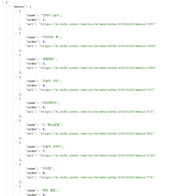 서버에서 메뉴를 받아오는 데이터같은 느낌을 주기위해 아래처럼 menus라는 키값 고정된 값의 배열을 주었습니다. 그리고 우측 상단에서 JSON 내보내기를 선택해주면 데스크탑에 JSON 파일이 간단히 저장됩니다.