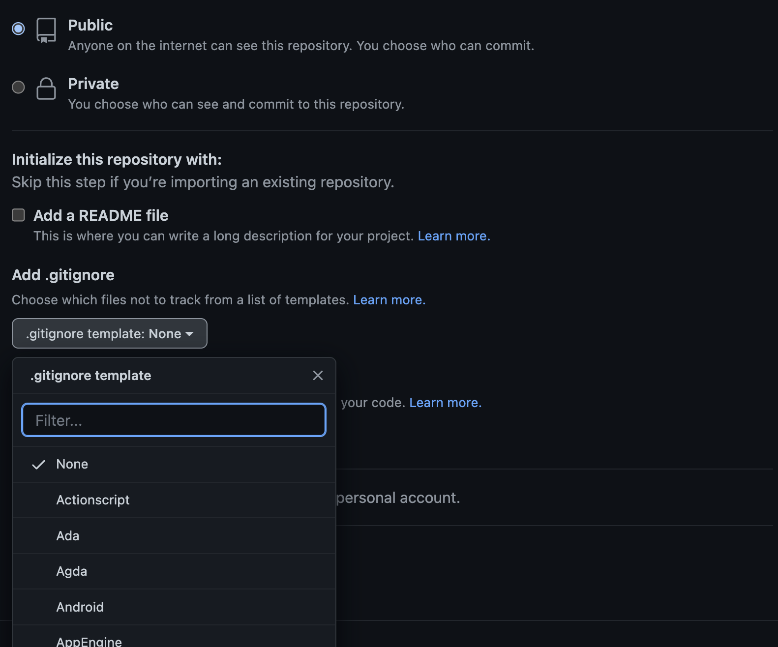 내용은 어렵지 않으니 이제 실제로 만들어보면서 진행해보도록 하지요. 사실 gitignore는 나중에 따로 만들어도 되지만, 처음 Git 레포지토리를 만들 때 같이 만들어 줄 수도 있습니다. 아래의 그림처럼 .gitignore 템플릿을 지원해주고 있죠.