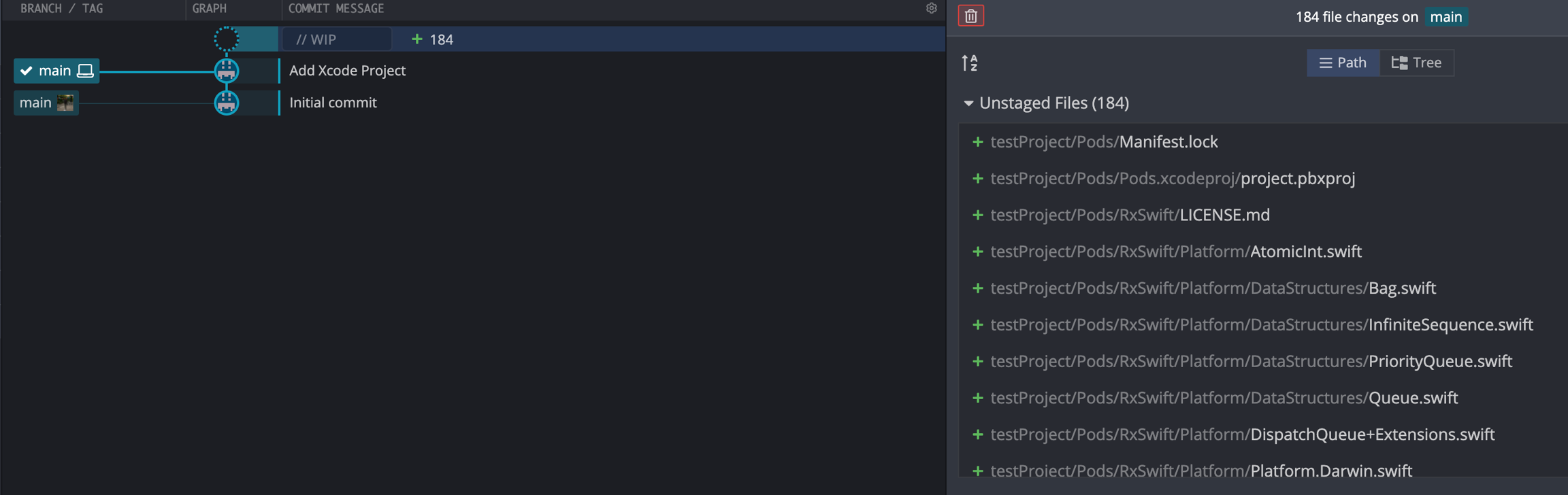 일단 test라는 레포지토리를 만들었어요. .gitignore 파일을 추가했고, 템플릿은 Swift를 선택했지요. 그리고 Xcode 프로젝트를 생성하고 커밋을 했습니다. 그리고 다시 CocoaPods을 설치해서 RxSwift를 설치 후에 어떤 작업을 하겠죠? 그리고 다시 커밋을 하려고 보니 제가 사용하는 툴인 Gitkraken에서 Pods 파일을 추적하는 상황이 생겨버린 겁니다.