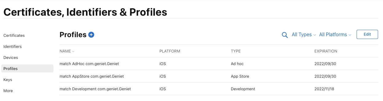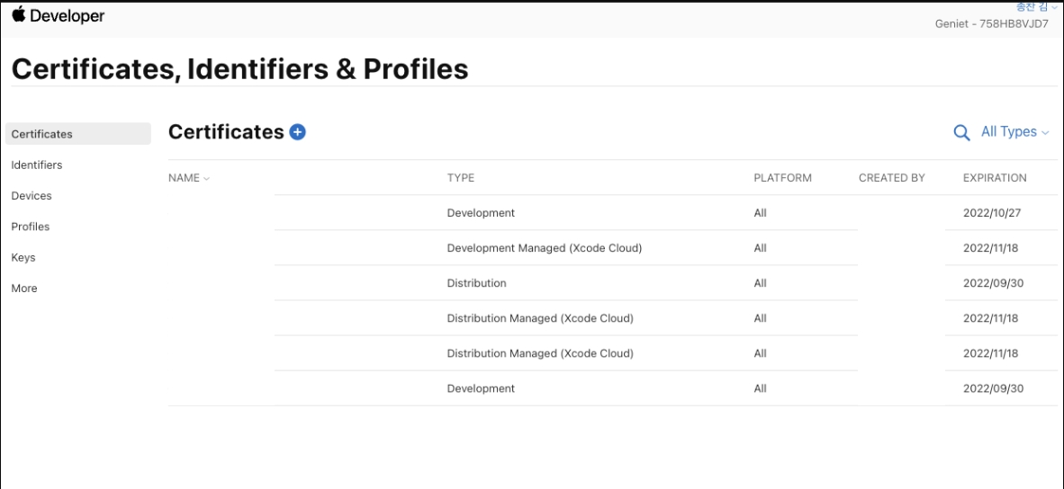 인증서는 인증서 이름, 타입, 플랫폼, 만료기간 등의 정보를 가지고 있다. 또 여기 홈페이지에서도 만들 수 있고, XCode에서도 만들 수 있다.