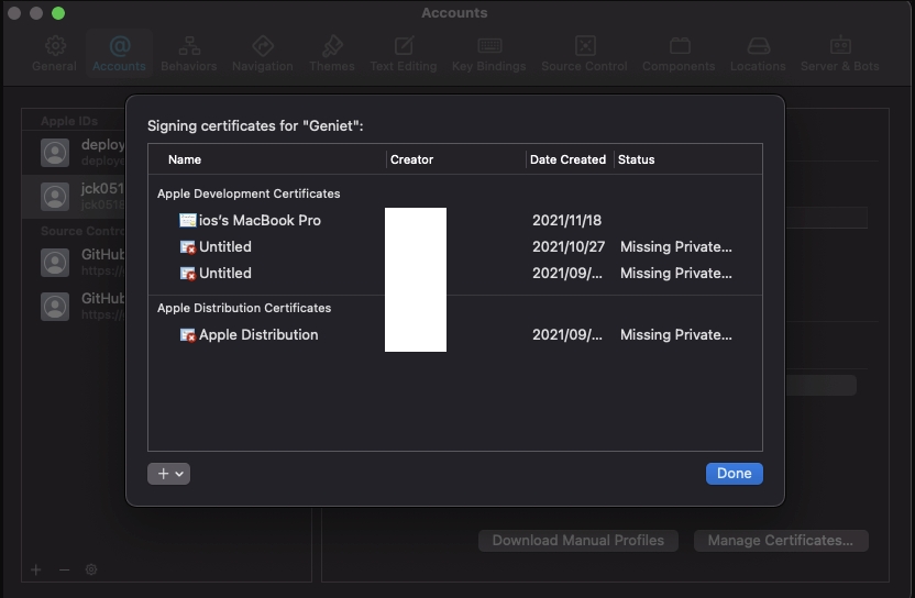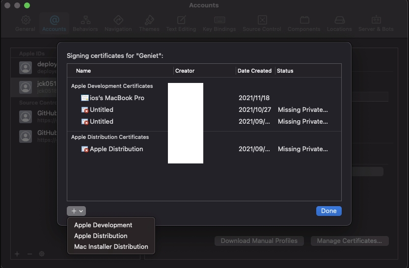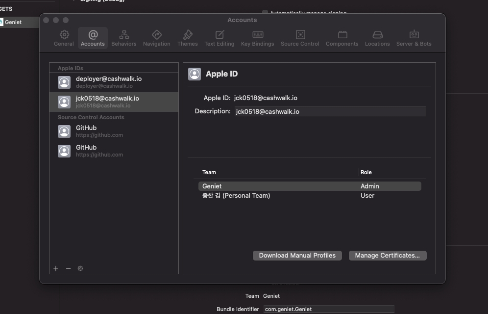 XCode로 만드는 더 쉬운 방법이 있다. XCode에서 Accounts창을 열고 권한을 받은 내 메일을 클릭하고 팝업창 우하단에 Manage Certificates를 클릭한다.