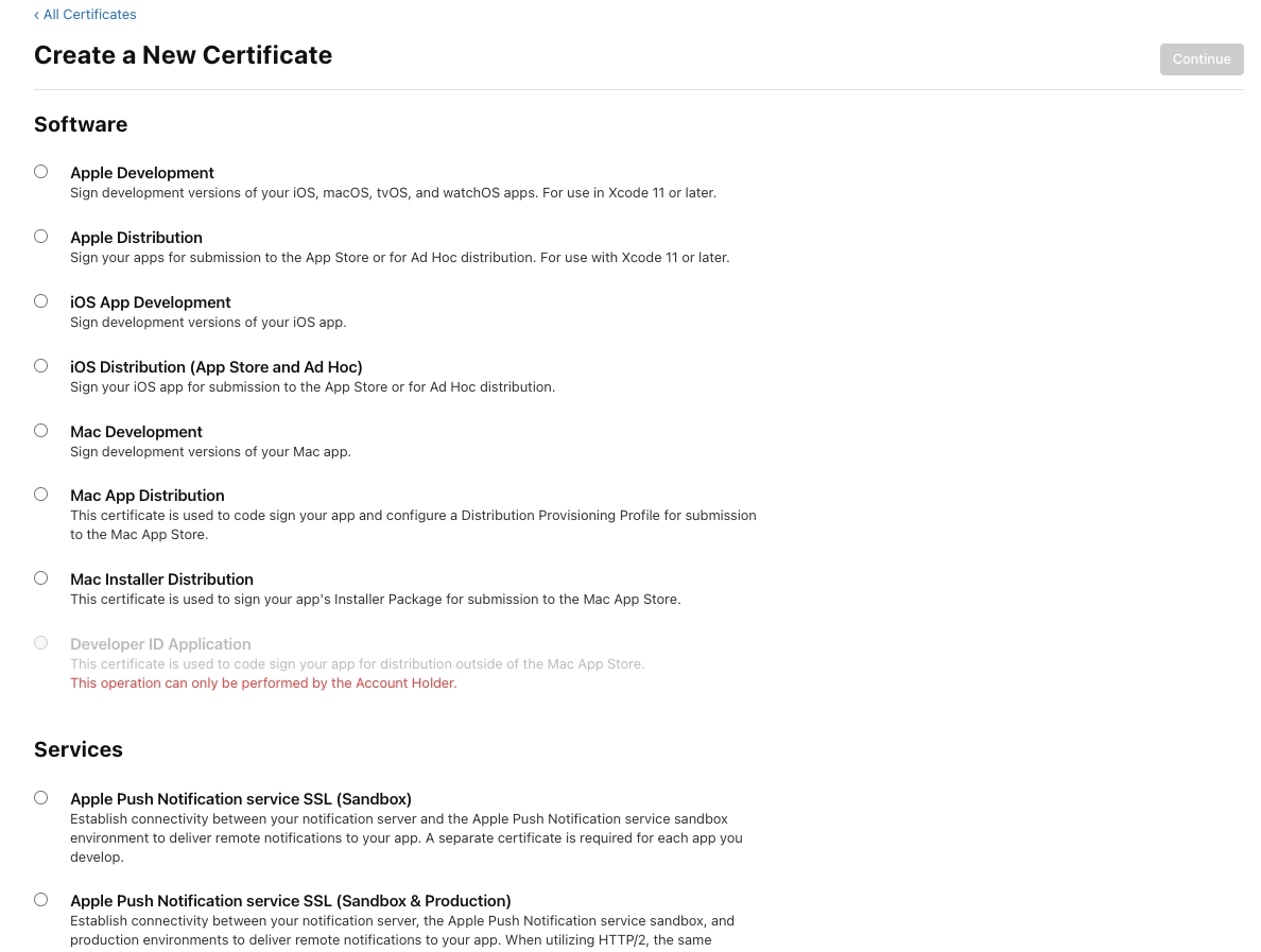 또 + 를 눌러보면 인증서를 선택할 수 있는 타입이 있는데, 푸시 관련한 인증서 같은 경우는 홈페이지에서만 만들 수 있는 것 같다. 개발/배포용은 XCode에서 바로 생성이 가능하다.