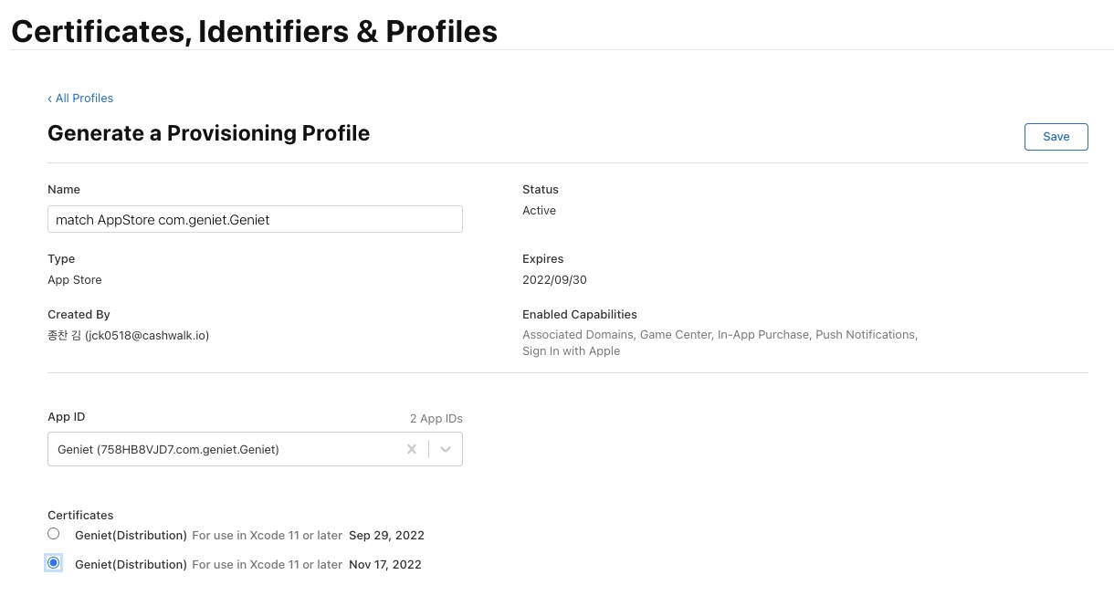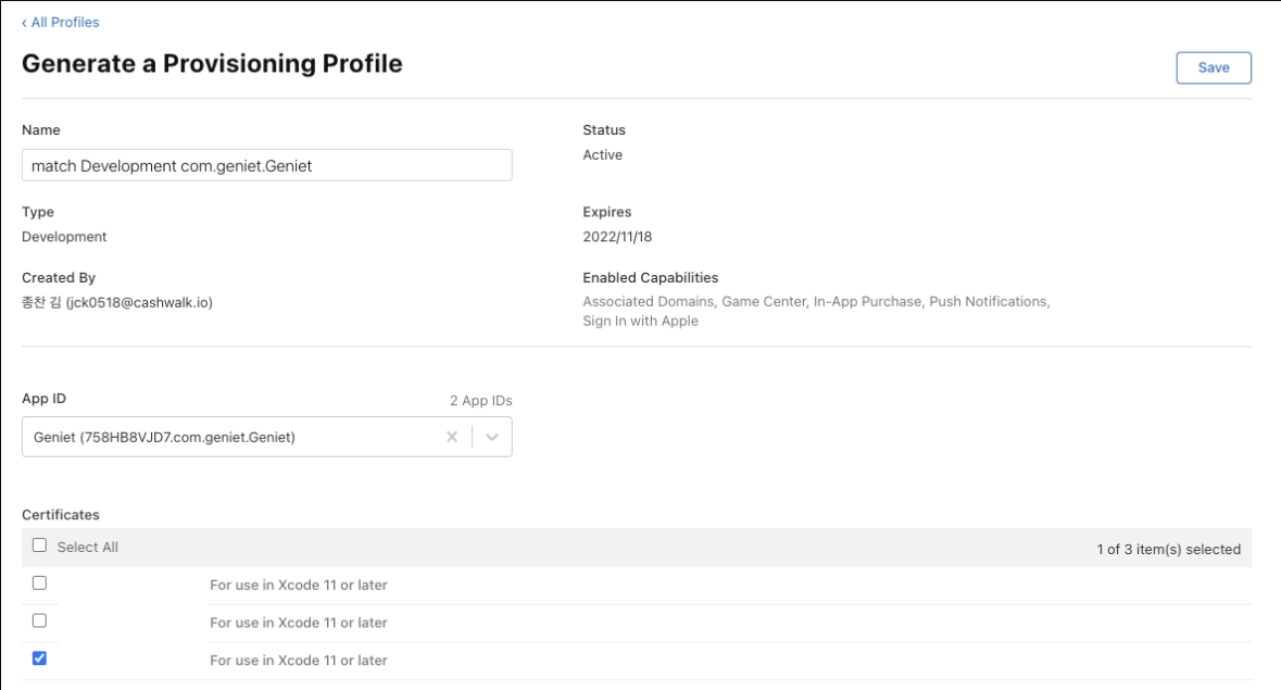 또 유의사항이 있다. 개발용 말고 다른 프로비저닝 파일을 편집할때도 왼쪽 아래 인증서에서 내가 생성한 인증서와 맞는 (2022년 11월 17일까지 만료기간) 애를 클릭해줘야 한다. 그렇지 않으면 빨간색 에러가 뜬다.