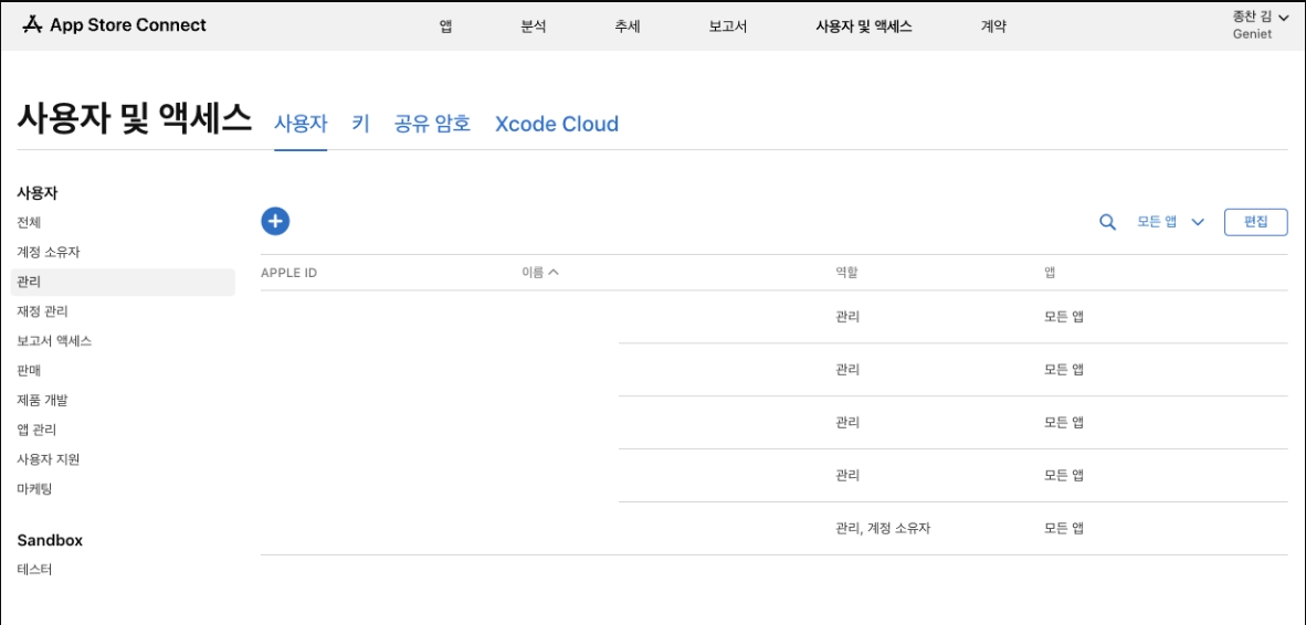 내 권한은 어떻게 확인하냐면, 아래에서 볼 수 있다. https://appstoreconnect.apple.com/access/users