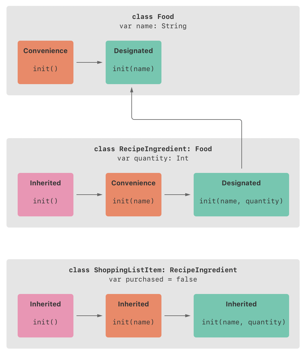 그리고 RecipeIngredient는 내부에서 init(name: String) 이니셜라이저를 편의 이니셜라이저로 제공하지만, 상위 클래스의 지정된 이니셜라이저 모두의 구현을 제공했습니다. 따라서 RecipeIngredient는 위에서 배웠던 이니셜라이저 자동 상속 조건의 2번째에 근거하여 상위 클래스의 모든 편의 이니셜라이저도 자동으로 상속합니다.