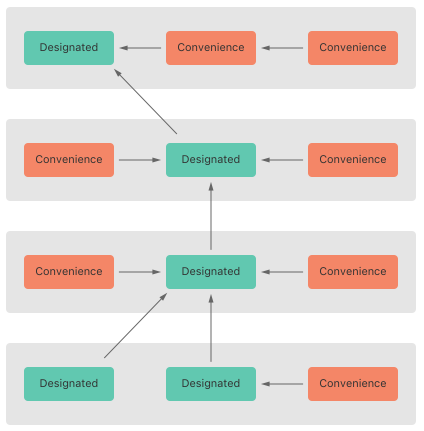 sub class가Designated Initializers(지정 이니셜라이저)를 정의하지 않으면 자동으로 모든super class의 지정 이니셜라이저를 상속합니다.sub class가 모든super class의 지정 이니셜라이저를 구현한 경우에는 자동으로 모든super class의Convenience Initializers(편의 이니셜라이저)를 상속합니다.