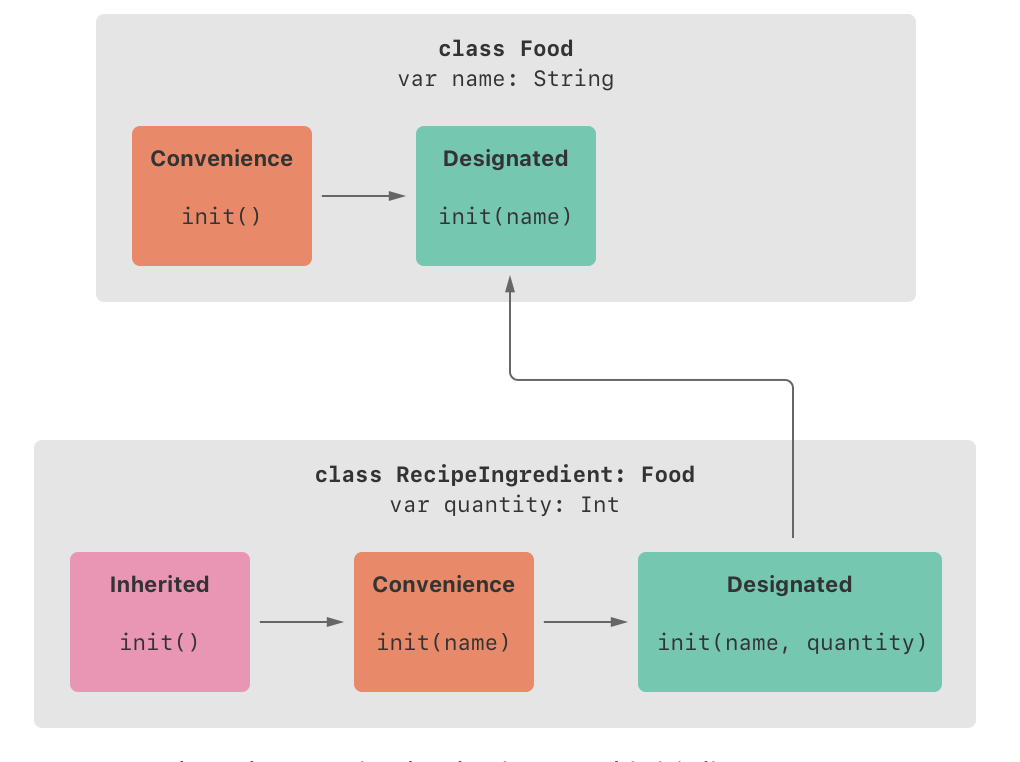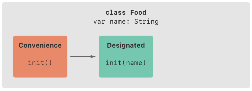 Food 라는 클래스가 있습니다. 지정 이니셜라이저와 편의 이니셜라이저가 각 1개씩 있고 상속은 없으므로 이 클래스의 이니셜라이저 체인은 아래 이미지와 같습니다.