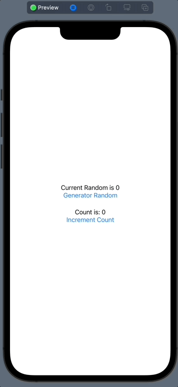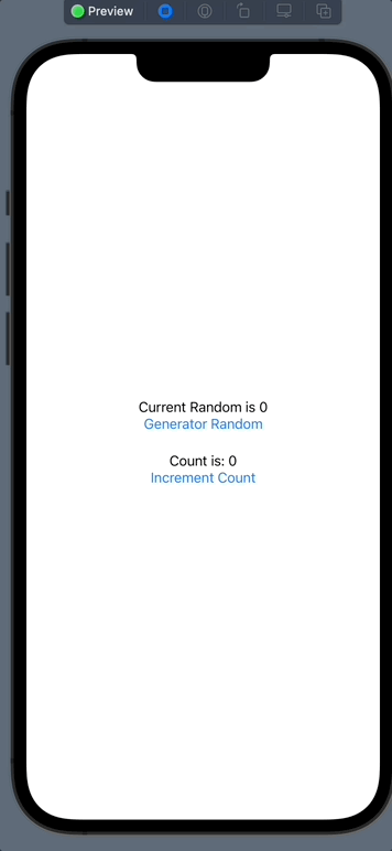 나머지는 변경된 것이 없어요. 자, 그럼 이렇게 한 상태에서 viewModel을 @ObservedObject로 하는 것과 @StateObject로 하는 것의 차이를 볼까요 ? 각각 Random 버튼을 3번 누르고 Count 버튼을 3번 눌러볼게요.