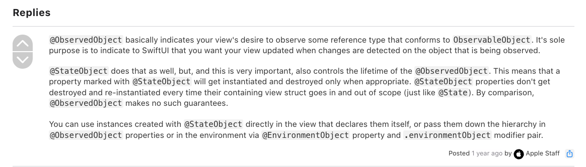 그러면, 각각 언제 @ObservedObject, @StateObject를 써야 할까요 ? 이것에 관해서는 애플의 포럼에서 답변한 오피셜 문서가 있습니다.
