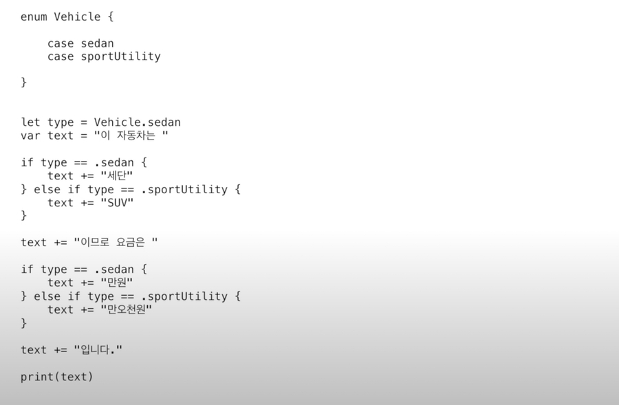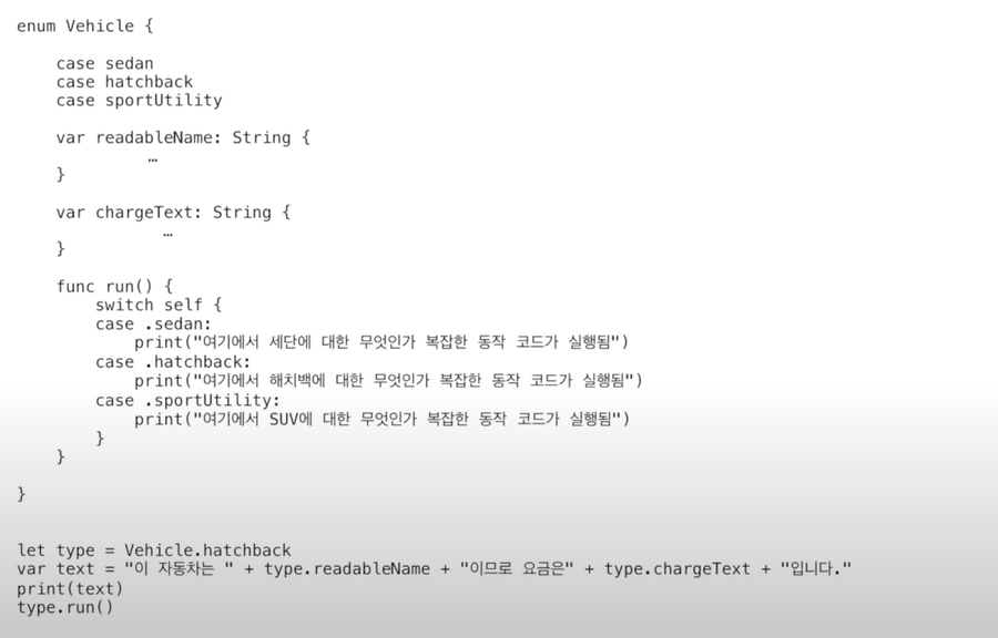 swift는 조금 더 세련된 표현을 할 수 있다. swift에서는 이런식으로 스위치문들이 enum안에 구현되어 있을 때 더 효과적인 코딩을 할 수 있다. case가 1번에 비해 하나 더 추가되었음에도 불구하고 가독성이 더 좋다.