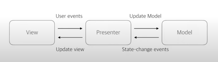 MVC와 유사하나 관점이 다르다. MVP에서 ViewController는 View로 취급된다. 기존의 컨트롤러의 역할은 Presenter가 한다. 대신 MVP는 뷰와의 관계를 끊는 형태로 구현하게 된다. 뷰와의 관계가 끊어진만큼 더욱 독립적이고 테스트하기 쉬워지는 형태이다.