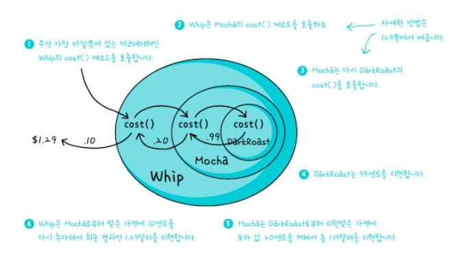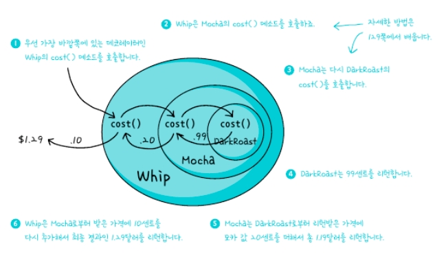 또, 생성자로 구성으로 가지고 있는 beverage을 입력받아 기존에 래핑 되어있는 데이터에 접근이 가능해서 그 값에 추가해서 최종결과를 리턴해준다.