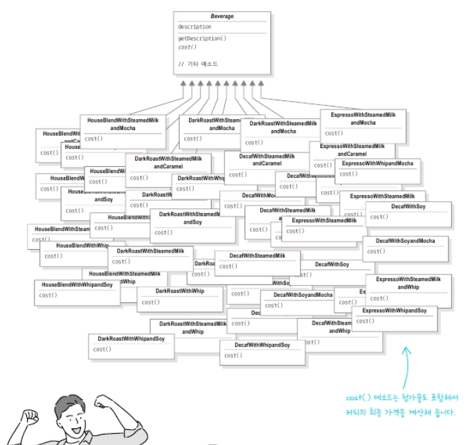 그런데, 우유/데운우유/두유/휘핑크림/모카...와 같은 메뉴 추가사항이 늘어납니다. 이때 추가된 메뉴별로 비용이 추가되기 때문에 여기서 상속을 사용하면 서브클래스가 폭발하게 됩니다.