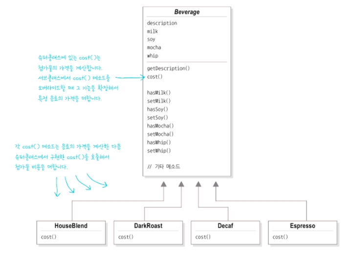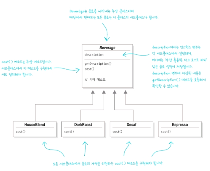 Beverage 클래스가 있고, 서브 클래스로 HouseBlend, DarkRoast, Decaf, Espresso가 있다. 이 클래스들은 내부에 description, cost() 이 구현되어 있다.