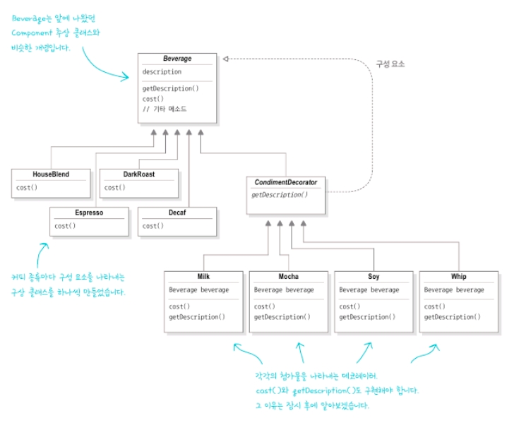 그리고 또 다이어그램을 보면 있는 우유, 모카, 두유, 휘핑크림같은 Decorator(장식)들이 CondimentDecorator를 상속한다.
