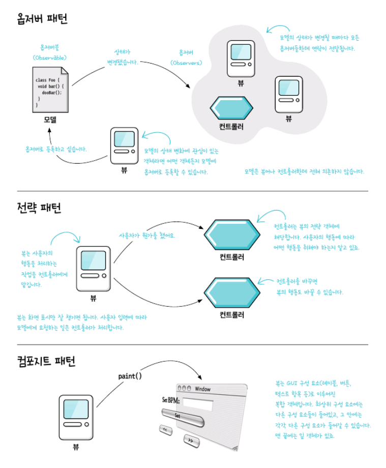 어떤 앱을 하나 만드는 문제를 해결하기 위해서 여러 개의 패턴이 복합적으로 사용된 다지인 중에 하나가 Model-View-Contrller 패턴 입니다.