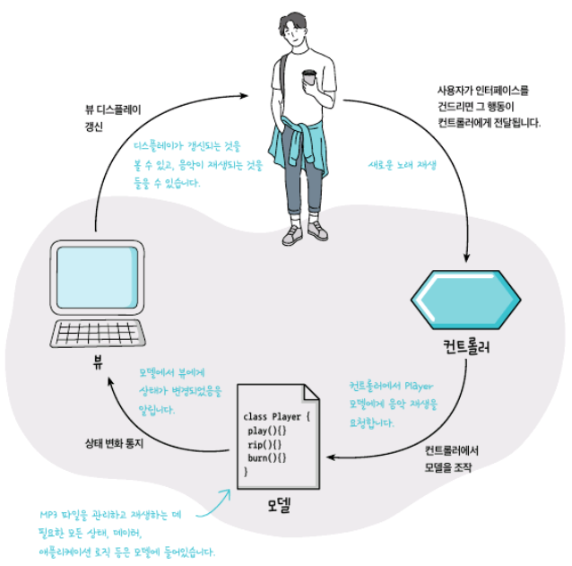 모델은 옵저버 패턴이 사용되어 있어요. 그래서 모델이 바뀔 때 마다 뷰와 컨트롤러에게 연락합니다.