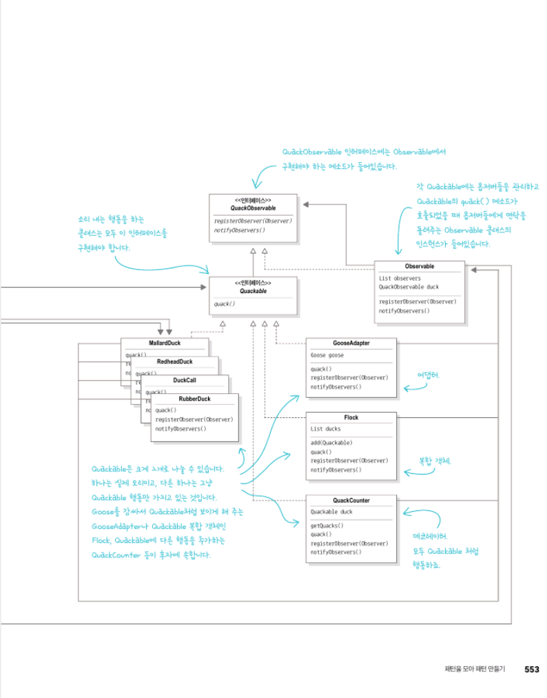 오리와 거위가 너무 많아짐에 따라 오리를 무리 단위로 관리하기 위해 컴포지트 패턴을 적용했고, Quackable에서 소리가 났을 때 연락을 받고 싶었기에 옵저버 패턴을 적용했습니다.