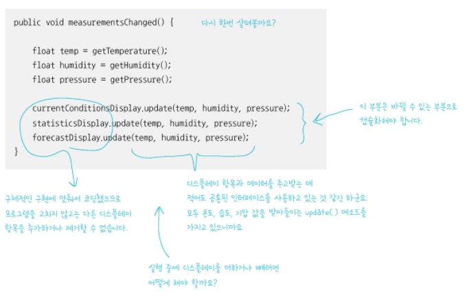 리팩토링은 먼저 Observer 인터페이스의 매개변수를 없앤다. 그러면 notifyObservers()도 일부 수정해야 한다.