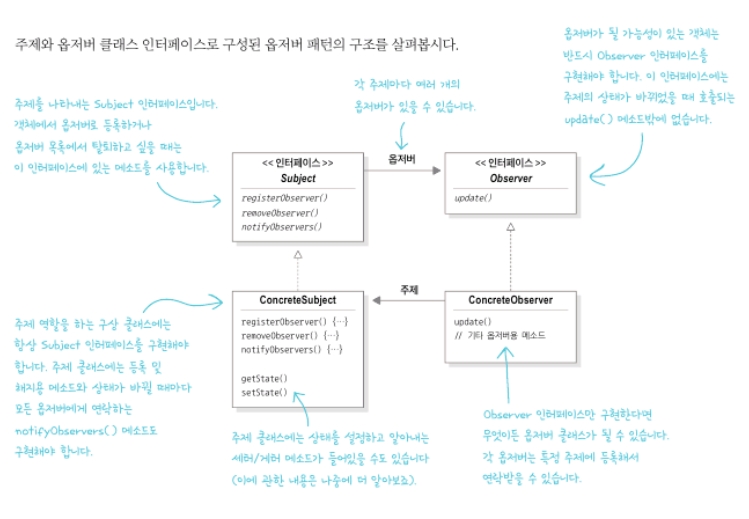 옵저버 등록, 옵저버 탈퇴, 이벤트 알림은 Subject의 메소드를 사용한다.