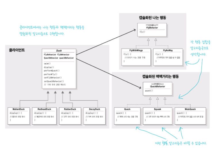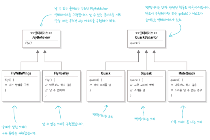 아래의 그림처럼 바뀌는 부분인 fly()와 quack() 행동을 따로 뽑아서 클래스 집합으로 만듭니다.