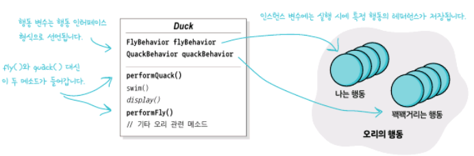 Duck 클래스에는 변수로 FlyBehavior, QuackBehavior을 가지고 있죠. 이렇게 하면 FlyBehavior, QuackBehavior가 더 상위 타입이기 때문에, 여러 가지의 행동 중에 하나로 초기화 할 수 있지요.
