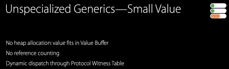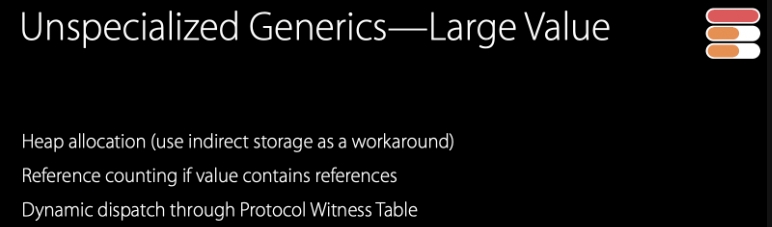 특수화 되지 않은 제네릭, 3 words 이상의 큰 값은 힙 할당 많음, pwt를 통한 dynamic dispatch를 사용합니다.