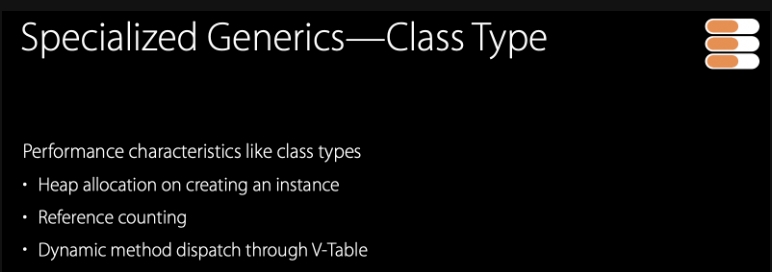 특수화 된 제네릭, class는 힙 할당 사용, 레퍼런스 카운팅 있음, v-table을 통한 dynamic dispatch를 사용합니다.