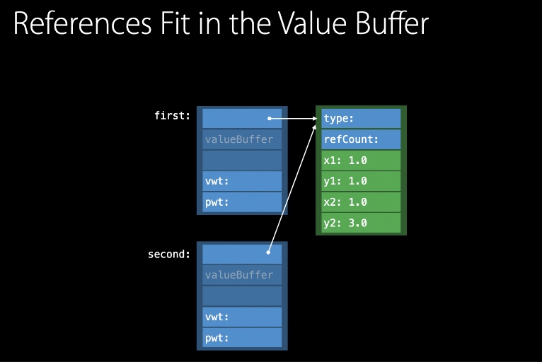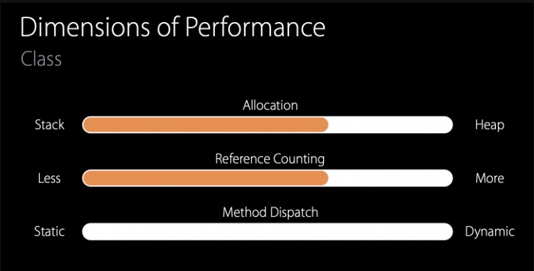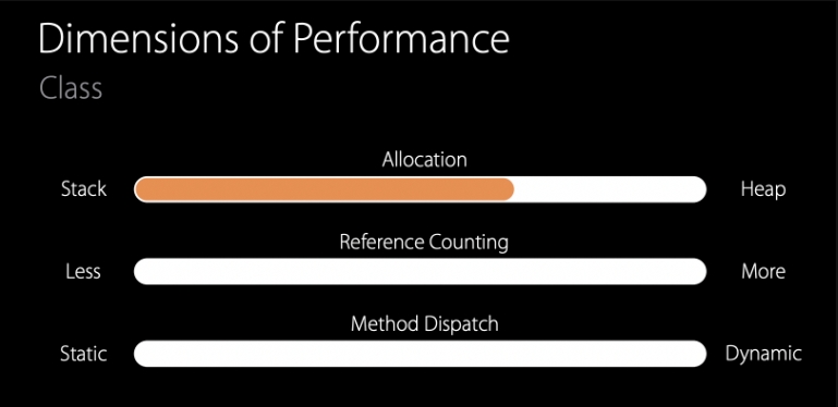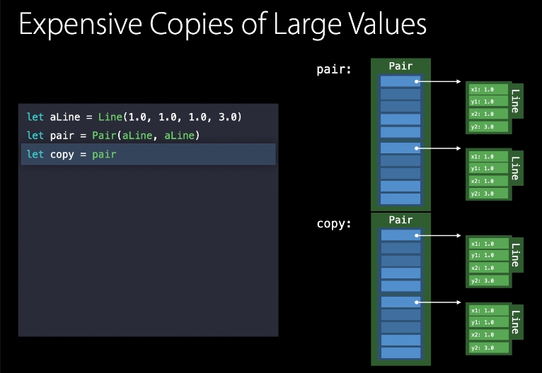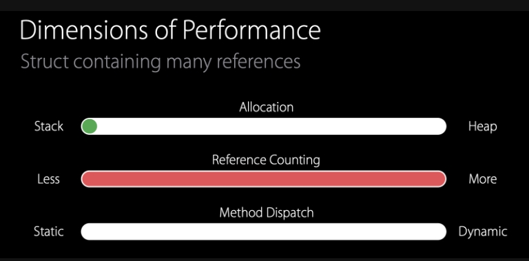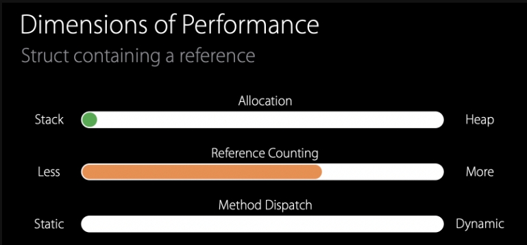 실제로 구조체는 포함된 참조 수에 비례하는 reference counting overhaed를 지불하게 되는 거죠. 2개 이상의 참조를 포함하는 구조체의 경우 오히려 클래스보다 효율이 좋지 않습니다.