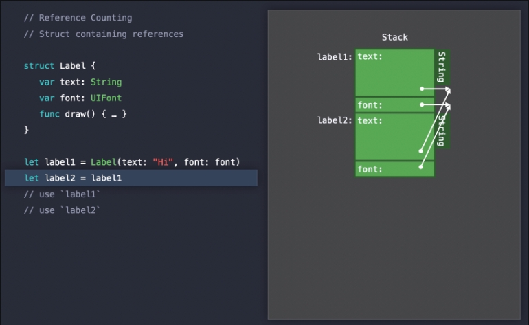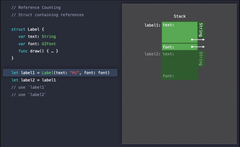 결론적으로 클래스였으면 reference counting overhaed가 2개면 됐을건데, struct는 label1과 label2이 독립적인 인스턴스이므로 reference counting overhaed가 4개가 발생되어 버립니다.