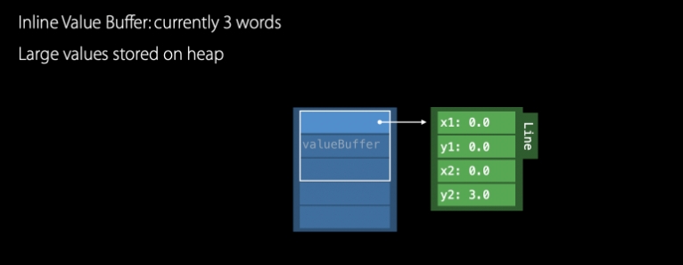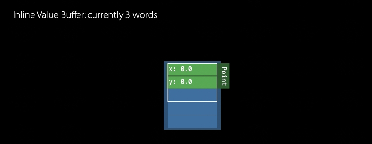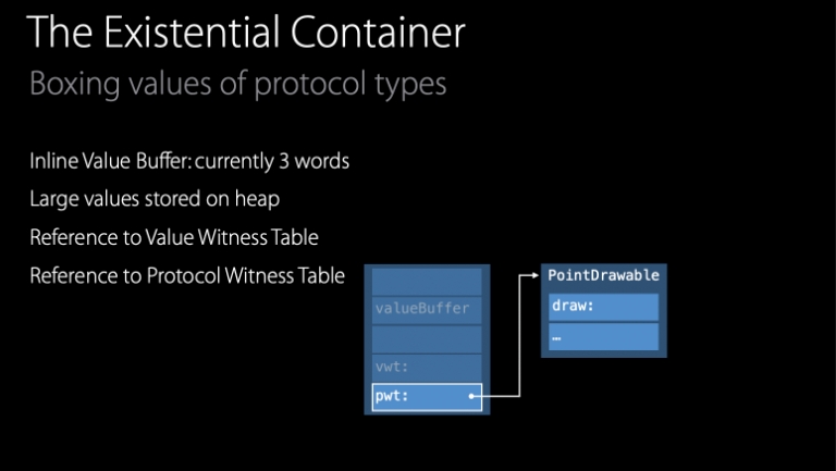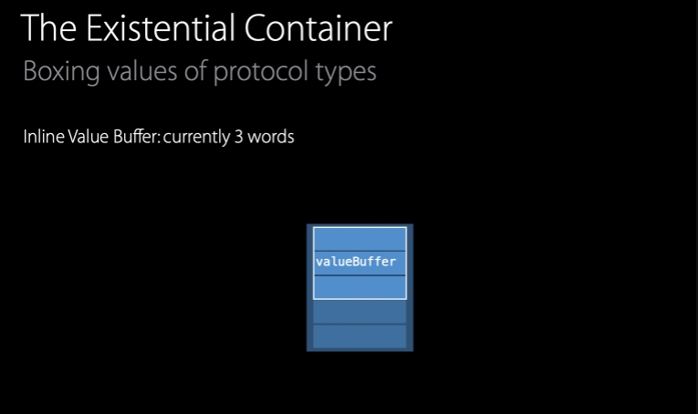 struct에서 변수의 개수가 다른데 어떻게 메모리를 할당하는지에 대한 대답은 existential container를 사용하는 것입니다.프로토콜 타입에서만 사용되는 컨테이너이구요 struct입니다. 아래 그림을 보면 알 수 있지만, 3 words 크기의 버퍼를 가지고 있습니다. 1 word는 64bit CPU는 8byte(64bit), 32bit CPU는 4byte(32bit)의 크기를 가지고 있어요. 나머지 공간에는 아래에 나올건데 vwt, pwt같은 메타데이터가 있습니다.