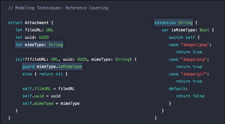 Attachment에는 첨부파일에 대한 디스크 경로를 저장하는 fileURL이 있고, 무작위로 생성된 고유 식별자를 위해서 uuid라는 String 프로퍼티가 있고, jpeg/png/gif같은 타입을 나타내는 mimeType이 있습니다. 우리 채팅방은 mp3, mov같은 타입은 지원하지 않기 때문에 failable initializer로 작성되었습니다. 타입을 지원하면 초기화, 아니면 실패인거죠.