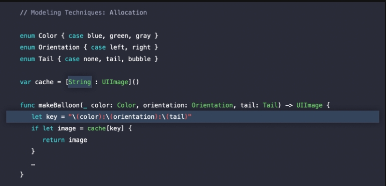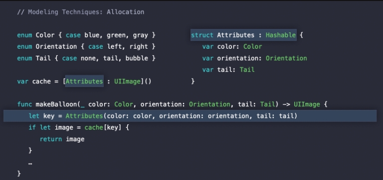해결책은 아래와 같습니다. Attribute라는 구조체를 만듭니다. 그리고 Hashable을 준수합니다. Swift에서 구조체는 일급 객체이므로 key값으로 사용할 수가 있습니다. 이렇게 하면 힙 할당이 필요 없어지므로 더 효율적인 코드가 됩니다.