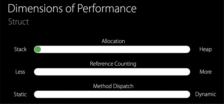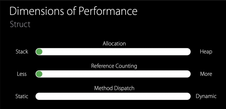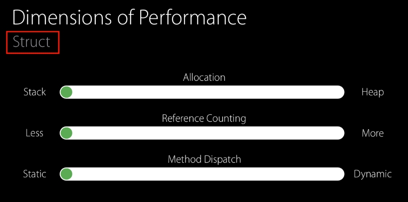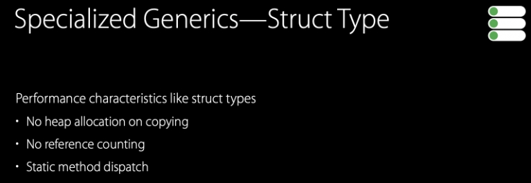 특수화 된 제네릭, struct는 힙 할당 사용안함, 레퍼런스 카운팅 없음, static dispatch 사용으로 제일 성능이 좋다.