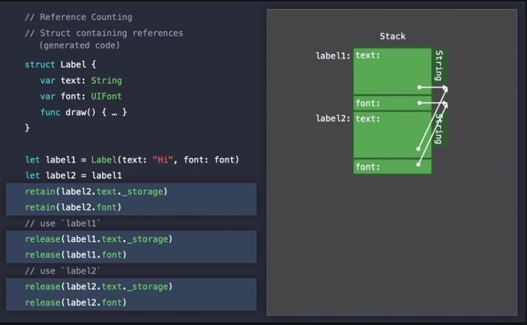 처음에 label1에 2개의 참조가 있습니다. 그리고 let label2라는 사본을 만들 때 실제로 2개의 참조를 더 추가합니다. 하나는 text storage에 하나는 font에 추가하죠. 이런 힙 할당은 refCount의 retain/release에 대한 호출을 추가하는 것입니다.