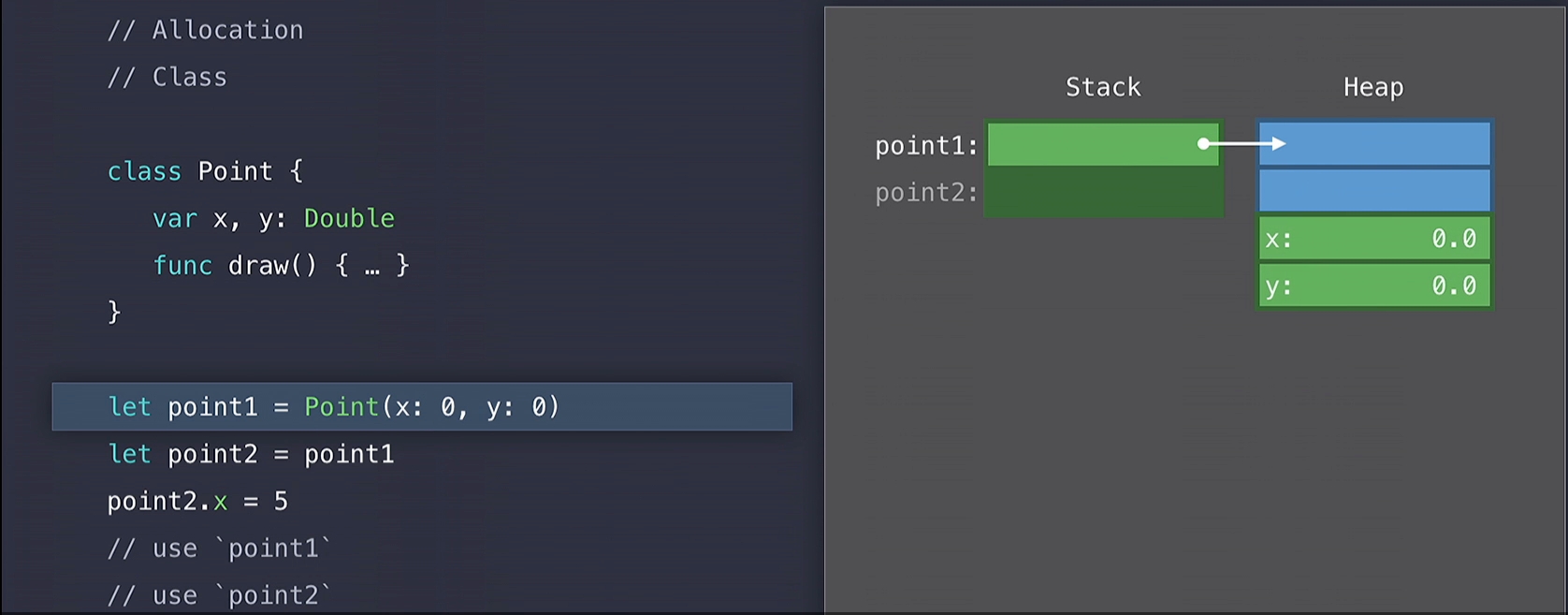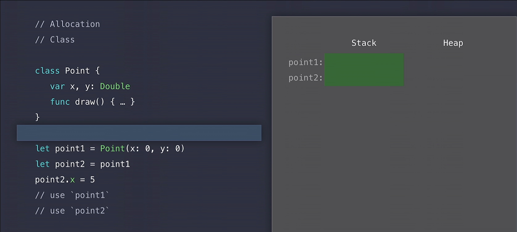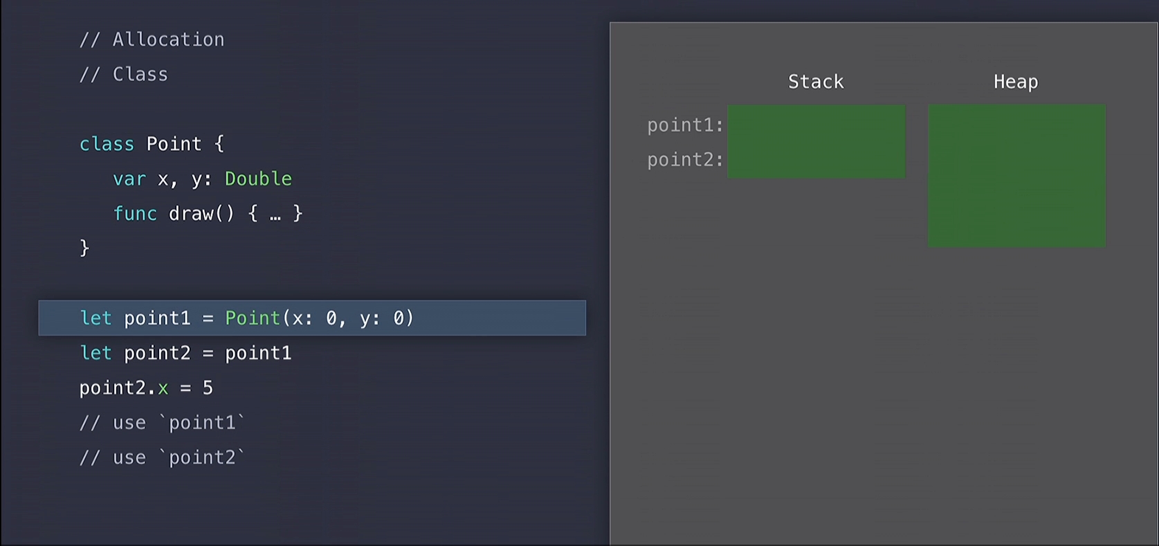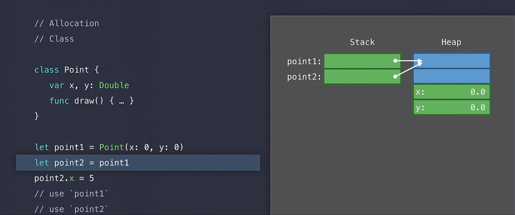 point2 = point1를 하게되면 힙에 있는 동일한 인스턴스를 참조하죠. 그래서 point2 = 5 와 같은 작업을 하면 의도치 않은 공유를 일으킬 수 있습니다.