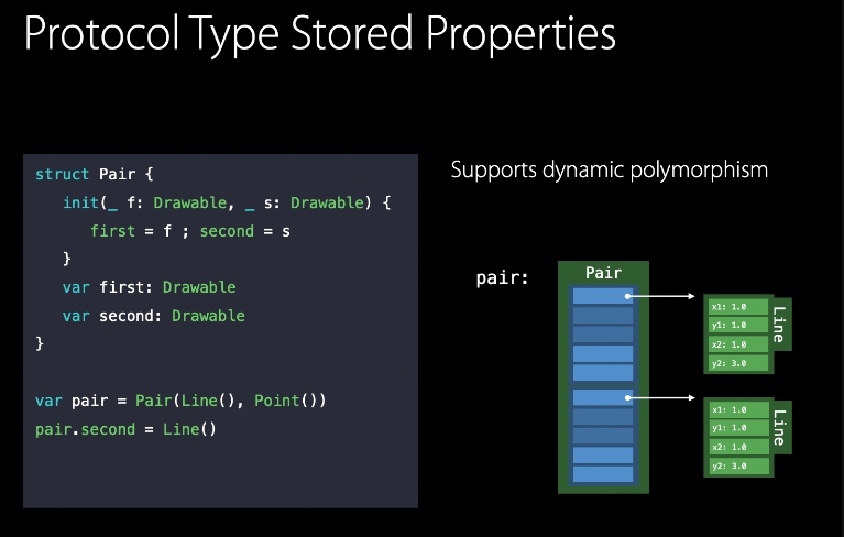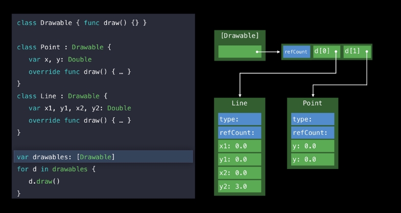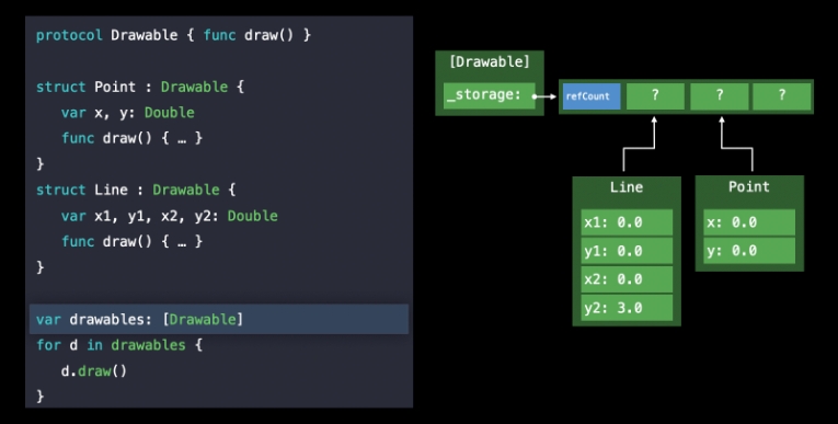 위의 Dynamic Dispatch의 그림 예시를 보면 쟤는 클래스죠? 그래서 어차피 스택에는 주소값만 가지고 있으니 d[0]과 d[1]의 크기가 같지만, 얘는 구조체잖아요? 그러면 변수의 개수가 2개와 4개로 다른데 힙 할당도 쓰지 않는데 어떻게 메모리를 할당할까요? Drawable이 뭔지 알고?