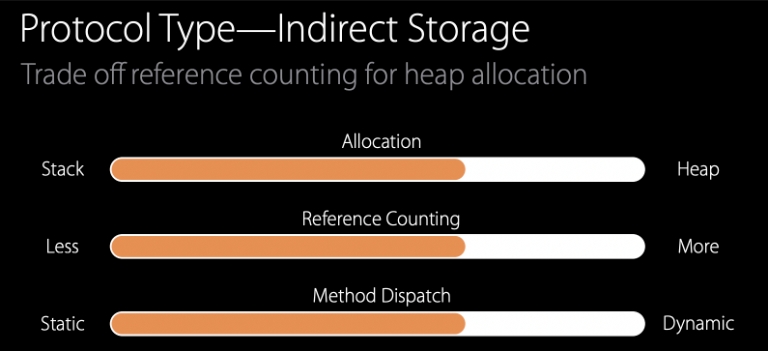 3 words 이상의 큰 값의 protocol type에서 Indirect Storage를 사용해서 코드를 개선하게 되면 두번재 사진처럼 힙 할당, reference counting, dynamic dispatch이 class를 사용할 때의 수준 정도로 맞춰지게 됩니다.