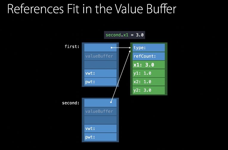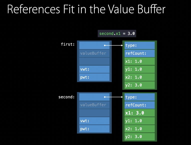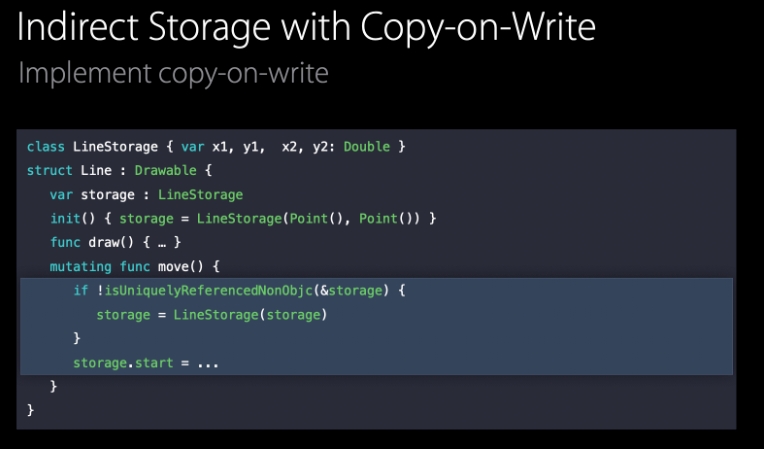 이거 해결 방법이 없을까요? 있습니다. 바로 Line()을 struct가 아니라 class로 만드는 겁니다. 그렇게 되면, 클래스는 reference semantic 이므로 3번째 그림처럼 참조만 하고 있고 refCount만 +=1 증가했을 겁니다.