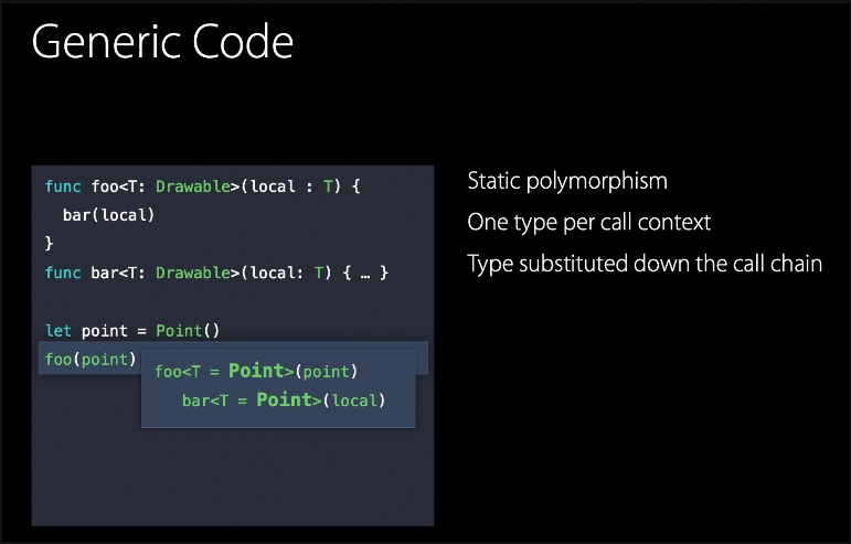 그런데, 약간 다른 부분이 있습니다. 함수의 매개변수는 값이 바뀌지 않잖아요? 세번째 사진을 예시로 하면 local: T 를 뜻하는거죠. 그래서 foo의 매개변수가 Point면 그걸 그대로 체이닝해가면서 bar에서도 Point인 겁니다. 제네릭이니까 다형성이긴 한데, 이게 함수 내에서는 변하지 않으니까 이걸 Static Polymorphism(정적 다형성) 이라고 합니다.
