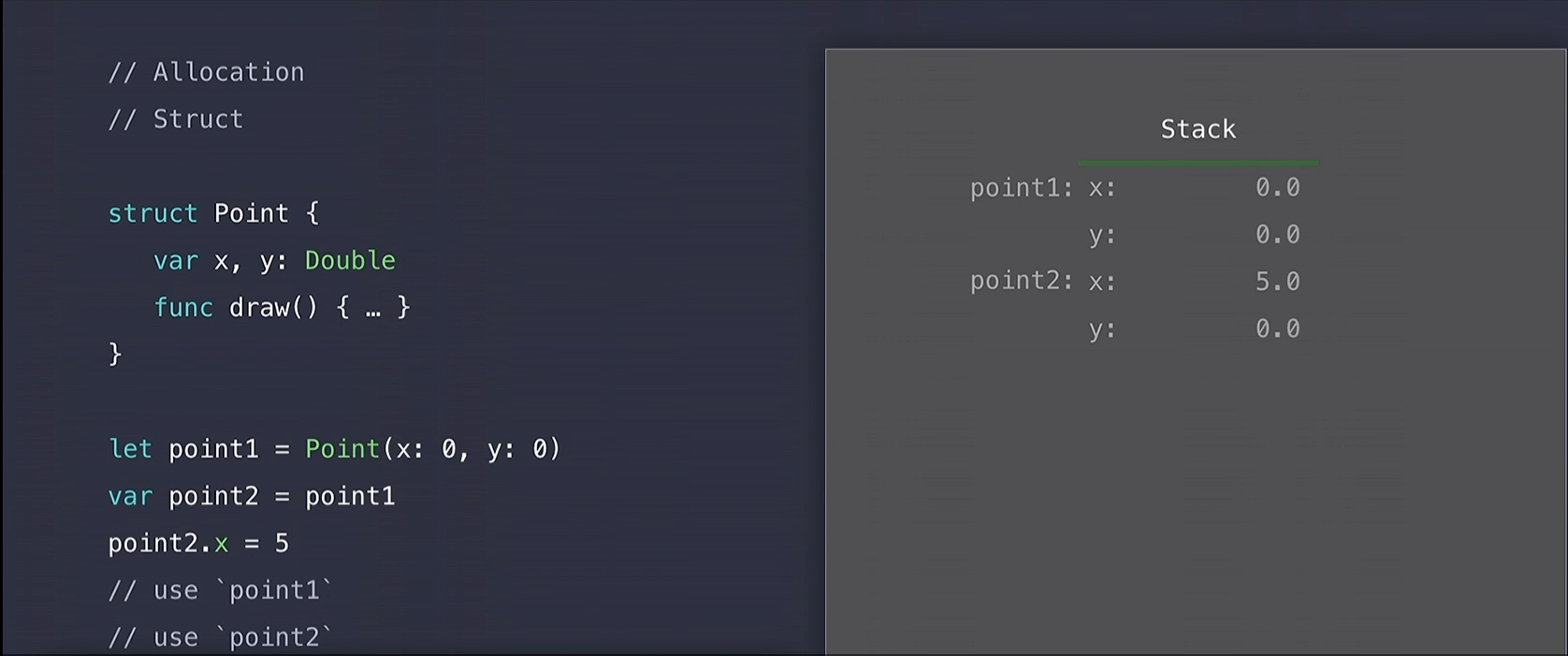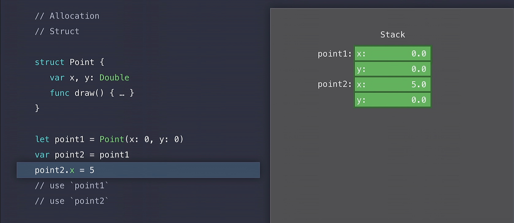 반면에 스택은 힙을 사용하지 않으므로 더 빠르지요. 값을 복사하므로 의도치 않은 상태 공유에 취약하지도 않습니다. 앱을 디자인하는데 추상화의 이런 특성이 필요하지 않은 경우라면 값 타입인 구조체를 사용하는 것이 더 좋습니다.
