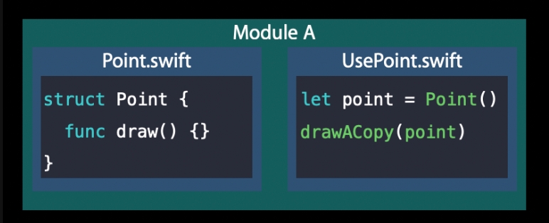 그런데 또 저 특수화의 기본 조건이 타입 추론이 가능해야 한 거겠죠? 그래서 아래 사진을 보면 알 수 있겠지만, Point.swift에는 Point가 구현되어있고 UsePoint.swift에서 Point를 사용하죠.