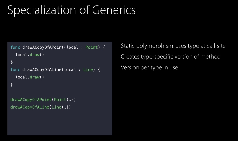 실제로는 아래의 사진처럼 컴파일러가 메소드를 만들어 준다고 합니다. 저희는 못보지만요. 이런 것을 제네릭의 특수화(Specialization)라고 합니다. 그래서 저런 경우에는 매개변수에 프로토콜 타입을 지정하는 것보다 꼭 제네릭을 사용하는게 퍼포먼스적으로 더 낫겠죠.